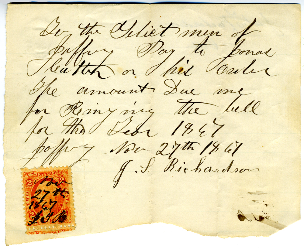 3. Document signed by J. L. Richardson relating to Jonas Cutter for ringing the bell in 1867.