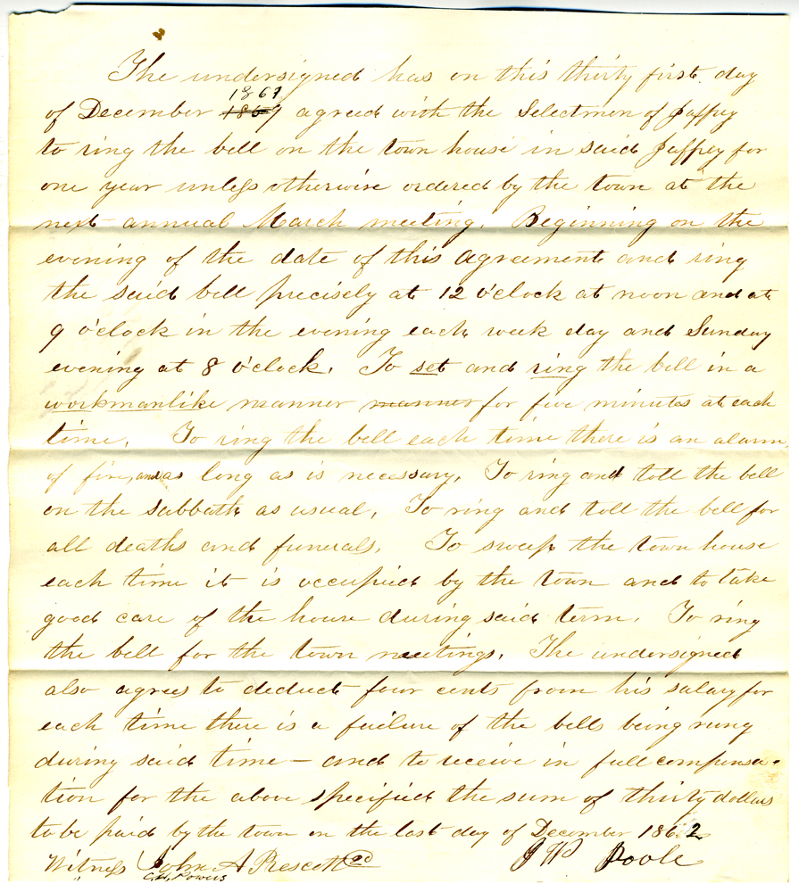 10. Document dated December 31, 1861, signed by J. W. Poole agreeing to ring the bell for a year from that date for a sum of thirty dollars.