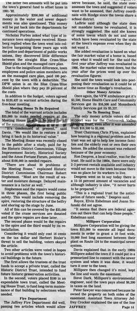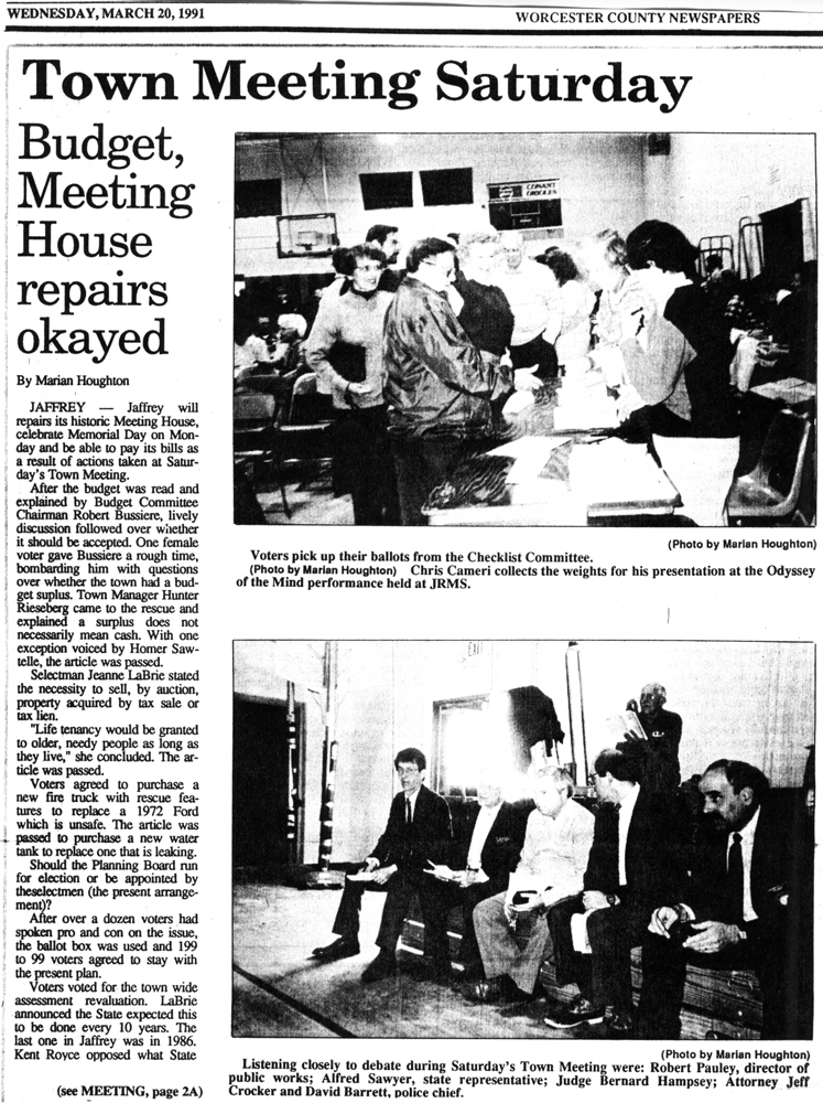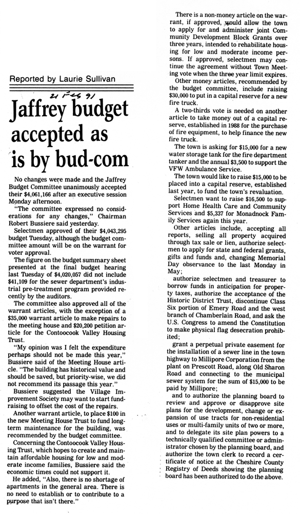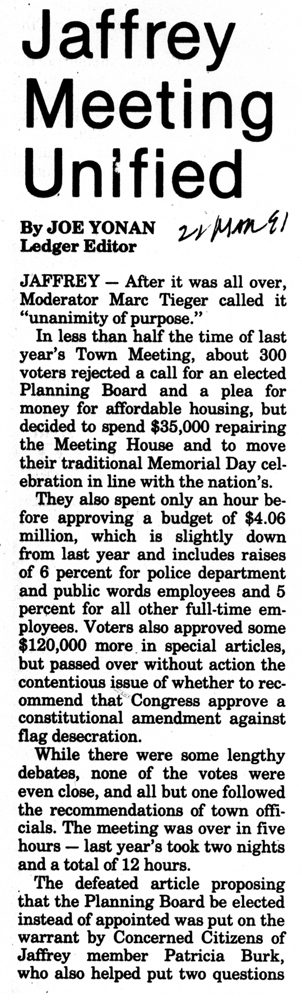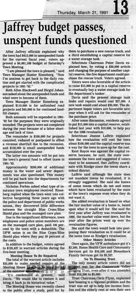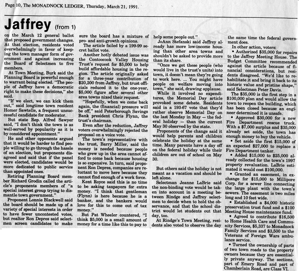 Jaffrey Rindge Chronicle. March 20, 1991. Pages 1-2.