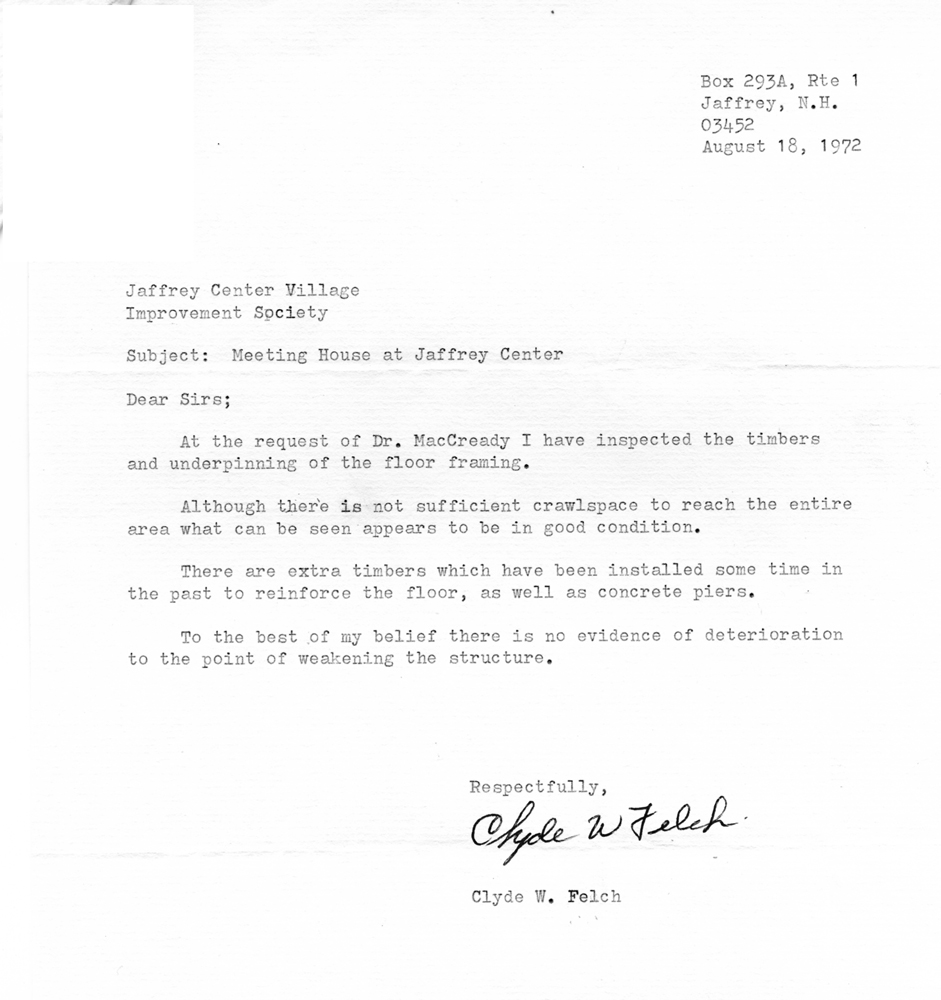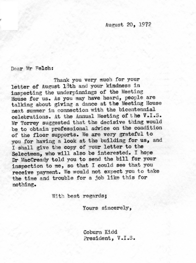 Letters betweeen Coburn Kidd and Clyde Felch, August 1972, regarding the floor loading of the Meetinghouse.