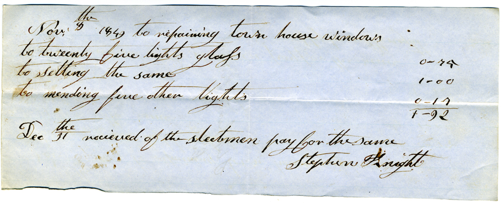 Bill dated November 8th, 1849 from Stephen Knight to the Selectmen for "repairing town house windows". Total 1.92