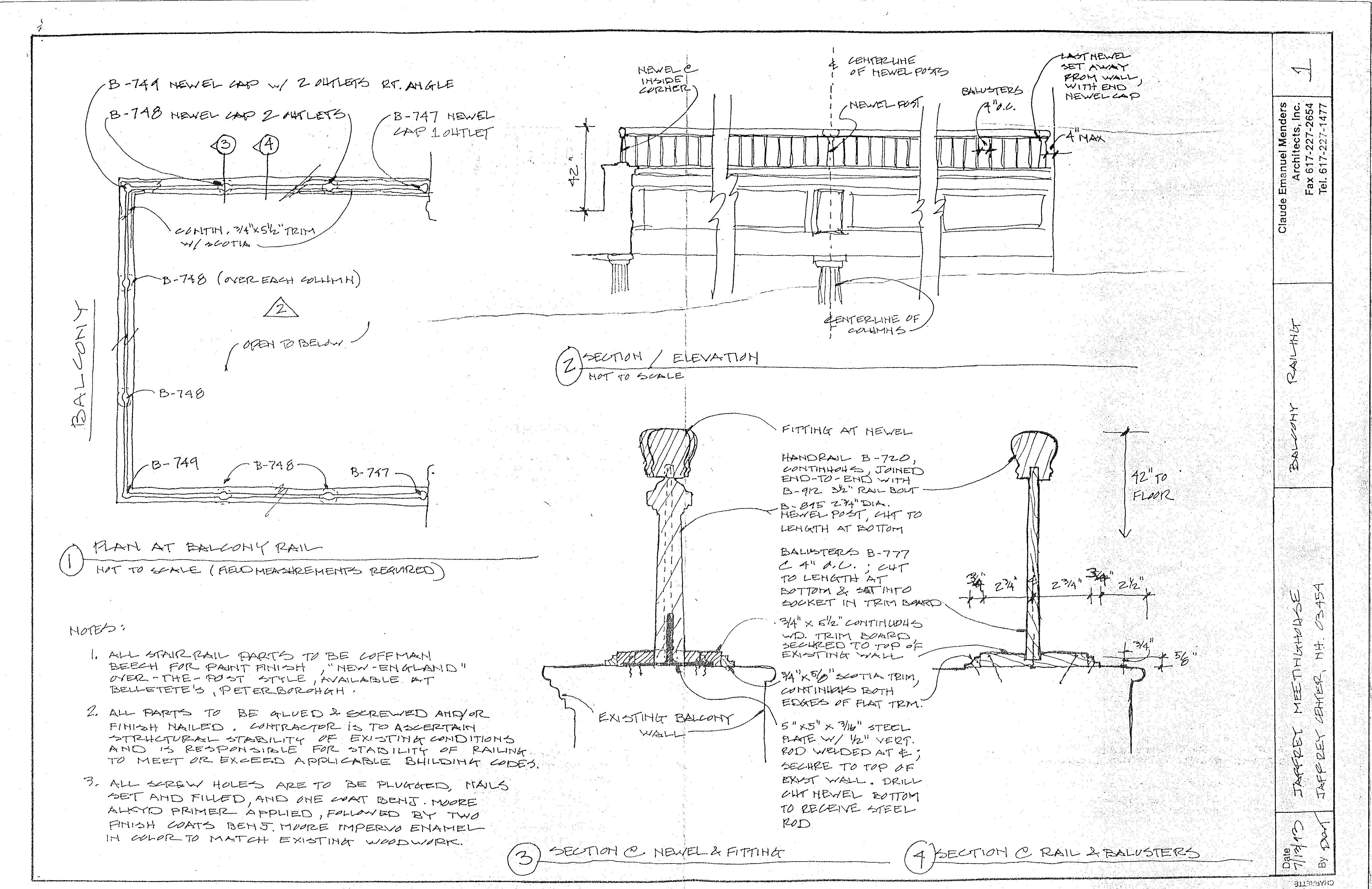 One sheet of plans, elevations and sections for the gallery ballustrade, by David Torrey, July 13, 1993.
