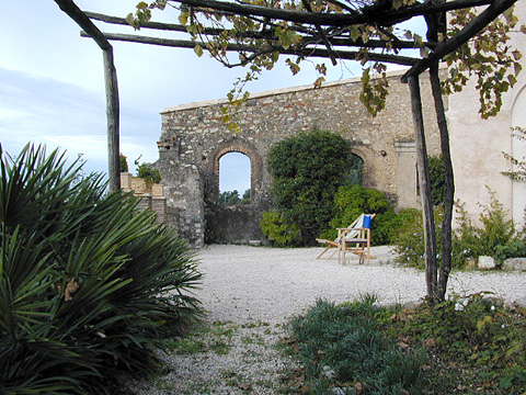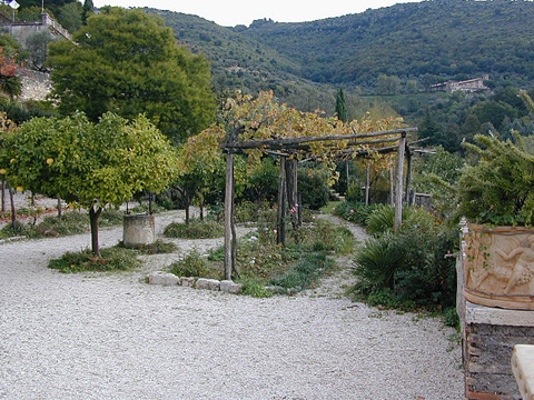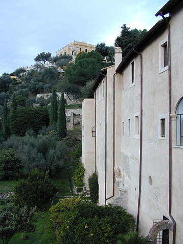 The truth is that the walls of a Roman villa, dated to about 60 bc and believed to have belonged to the poet Horace, survive up to the middle floor of the present house, itself begun in about 850 AD. Franciscan monks have lived here, and Popes. The final additions were made 'as late as the 17th century.' It was abandoned around 1870 and rescued by the Searles, who spent many years gently repairing it.
