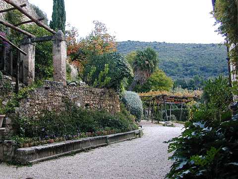 SOME INFO ON SANT' ANTONIO: Frederick Searle, who bought the old monastery of Sant' Antonio near Tivoli in 1878, first saw and fell in love with it when looking for a place from which to paint the great waterfall, across the ravine from the town. A visit today is equally one of enchantment: the little church at the top dedicated to the kindly Sant' Antonio of Padua; the simple rooms, each with a shuttered window opening on to the valley, the waterfall and Tivoli itself; the upper belvedere, giving a first full taste of what, with a few battered edges, can still be recognized as the 'loveliest view in the world.' Hints of a distant past appear in cells with mosaic floors and in the kitchen, where on the inner wall is some 'opus reticulatum,' a sign of Romans at work; but no moment is more thrilling than when, having passed through an arcaded loggia and down to the level of the fruitful, scented and beautiful terraced garden, an old door is opened in the house wallÑa moment it would be unfair to spoil by describing it in advance.