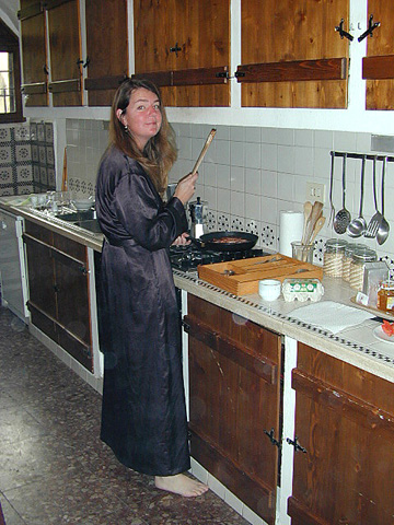 Two views of the kitchen. Claire, Peter, Duffy and Suzan at the table. Krista cooking breakfast.
