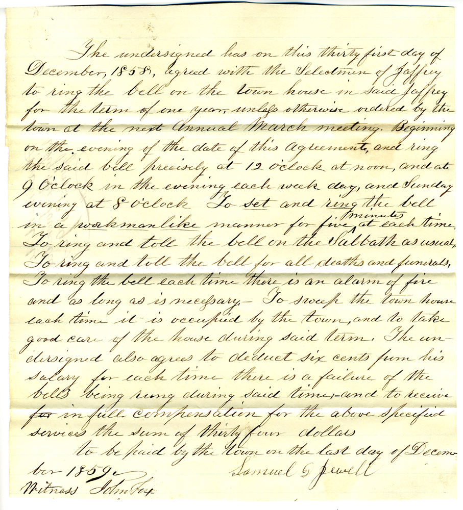 9. Document dated December 31, 1858, signed by Samuel ? Jewell agreeing to ring the bell for a year from that date for a sum of thirty four dollars.