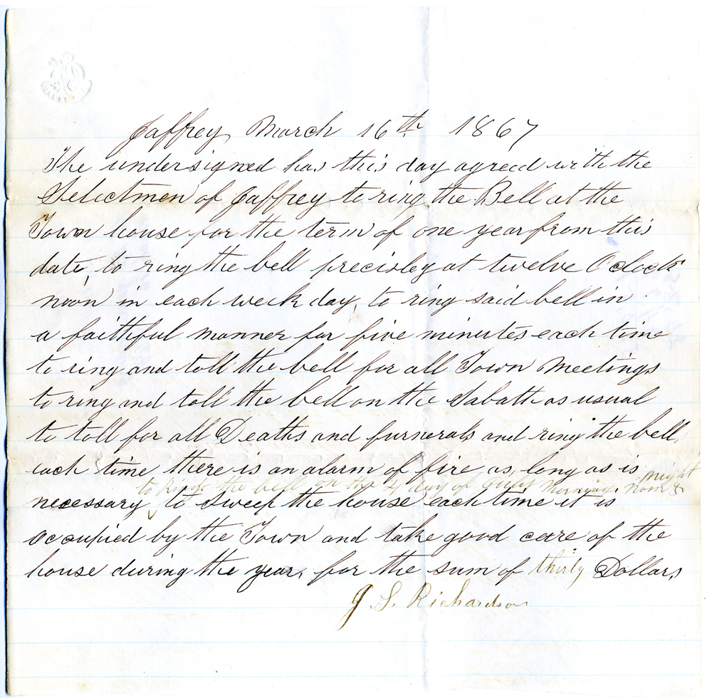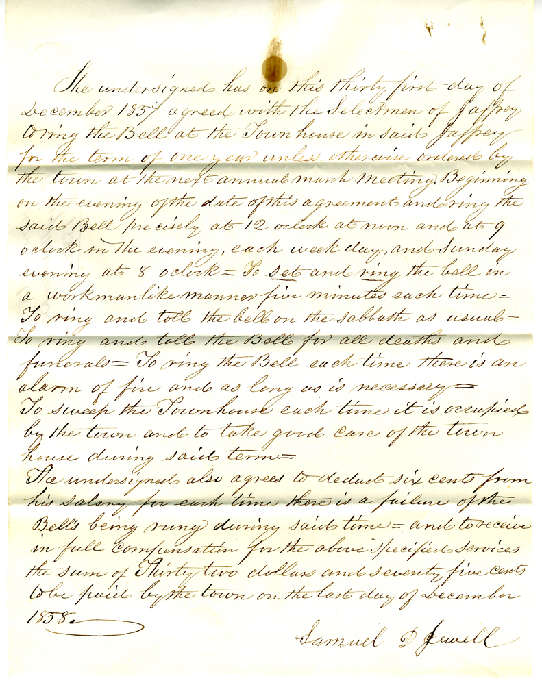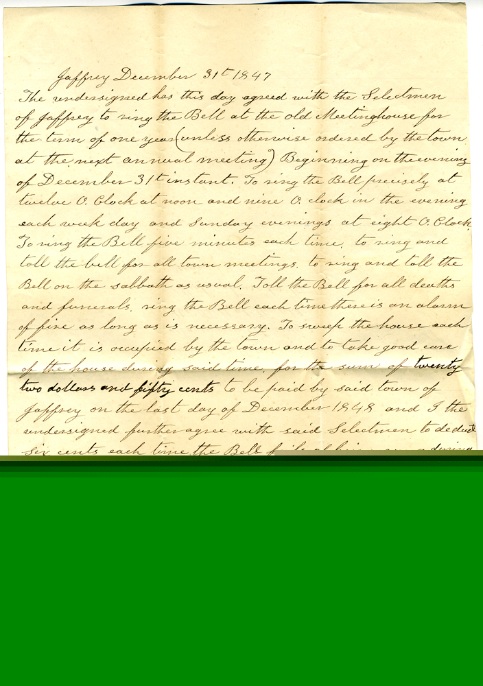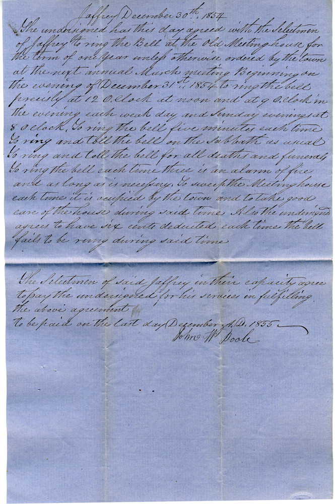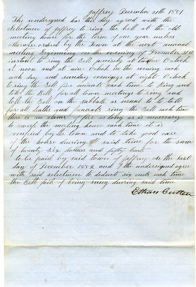 6. Document dated December 31, 1851, signed by Ethan Cutter. "… to ring the Bell precisely at twelve o'clock at noon and at nine o'clock in the evening each week day and Sunday evenings at eight o'clock to ring the Bell five minuts [sic] each time to ring and toll the Bell on the sabbath as usual to to [sic] toll for all deaths and funerals ring the Bell each there is an alarm of fire as long as it necessary to sweep the meeting hopuse each time it is occupied by the town and to take good care of the house during said time for the sum of twenty six dollars and fifty cents … and I the undersigned agree with said selectmen to deduct six cents each time the Bell fails of being rung during said time." NOTE: The wording of all the agreements here are similar to this.