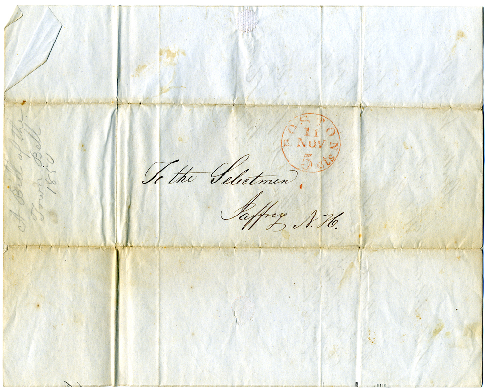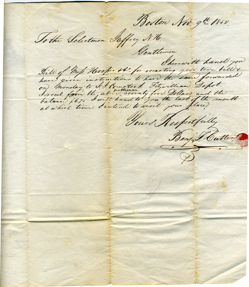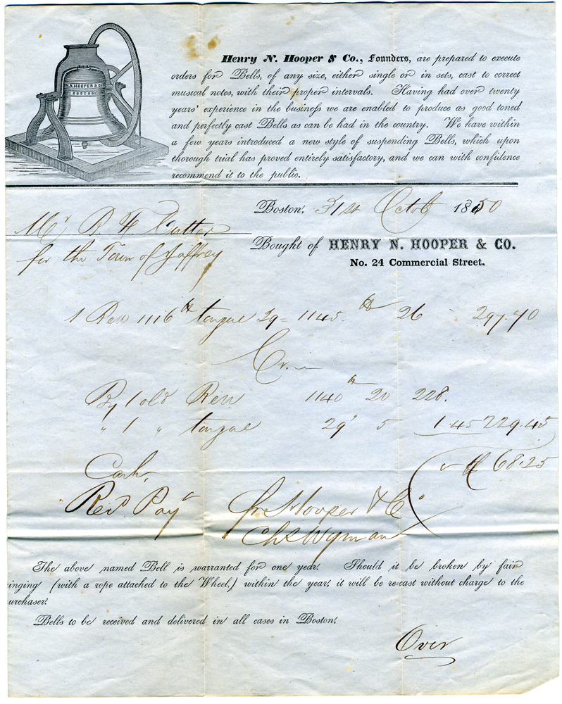 2. Receipt dated October 31, 1850 from Henry N. Hooper & Co. of Boston for recasting the bell. With a note on the verso from Benhamin Cutter.