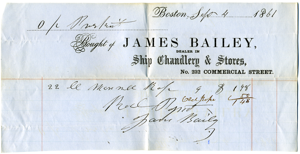 4. Receipt dated September 4, 1861, from James Bailey, Boston, for $1.48 for new "bell rope."