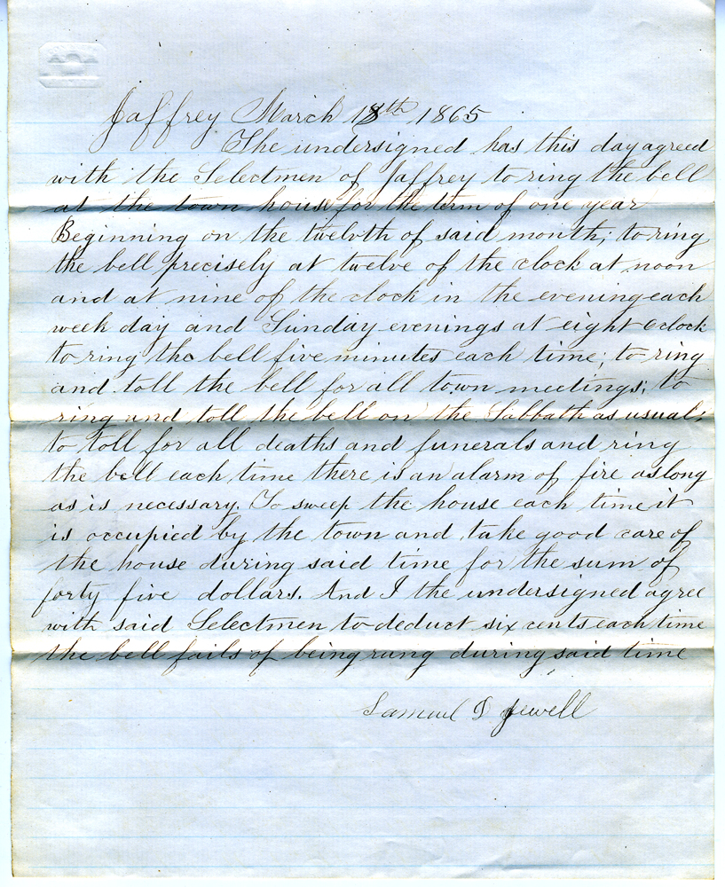 11. Document dated March 18, 1865, signed by Samuel ? Jewell agreeing to ring the bell for a year from that date for a sum of forty five dollars.