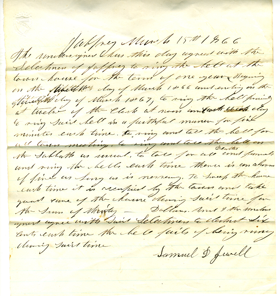 12. Document dated March 15, 1866, signed by Samuel ? Jewell agreeing to ring the bell for a year from that date for a sum of thirty dollars.