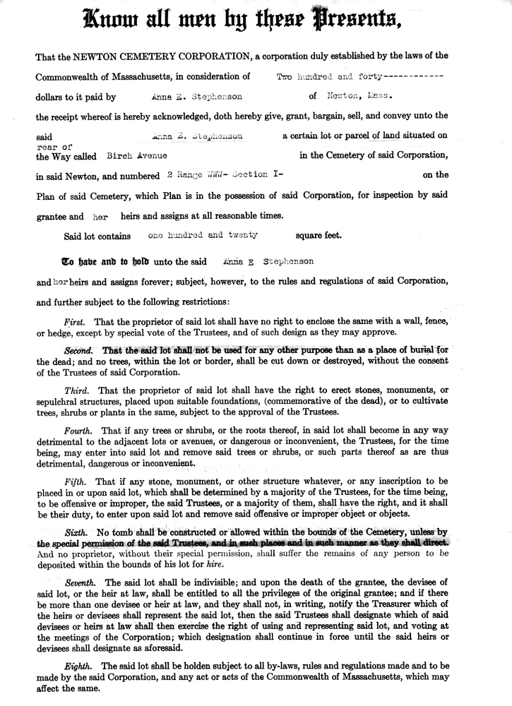 11-02. Deed for cemetery plot 2 Range WWW Section I, Birch Avenue, Newton Cemetery, sold to Anna E. Stephenson, July 25, 1929.