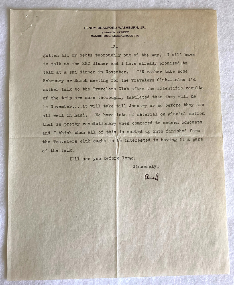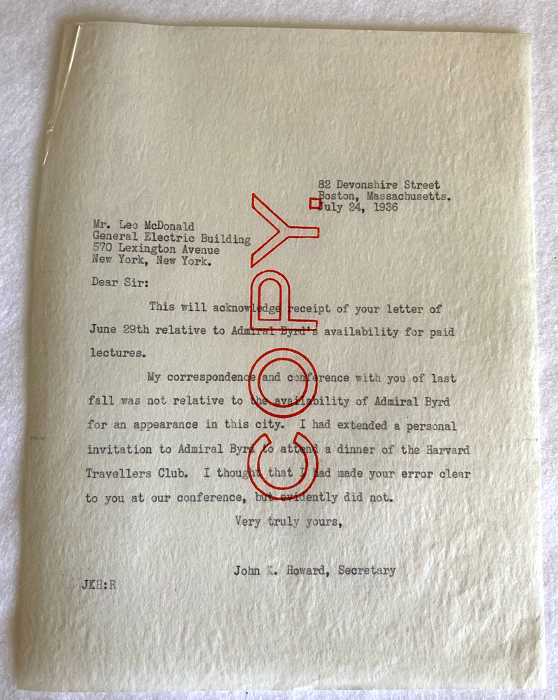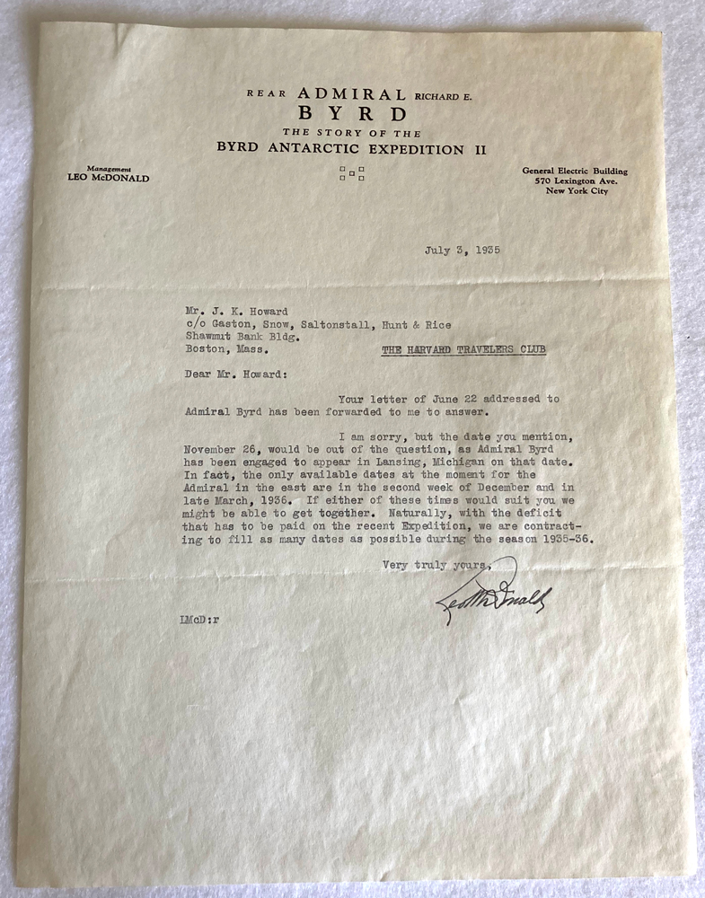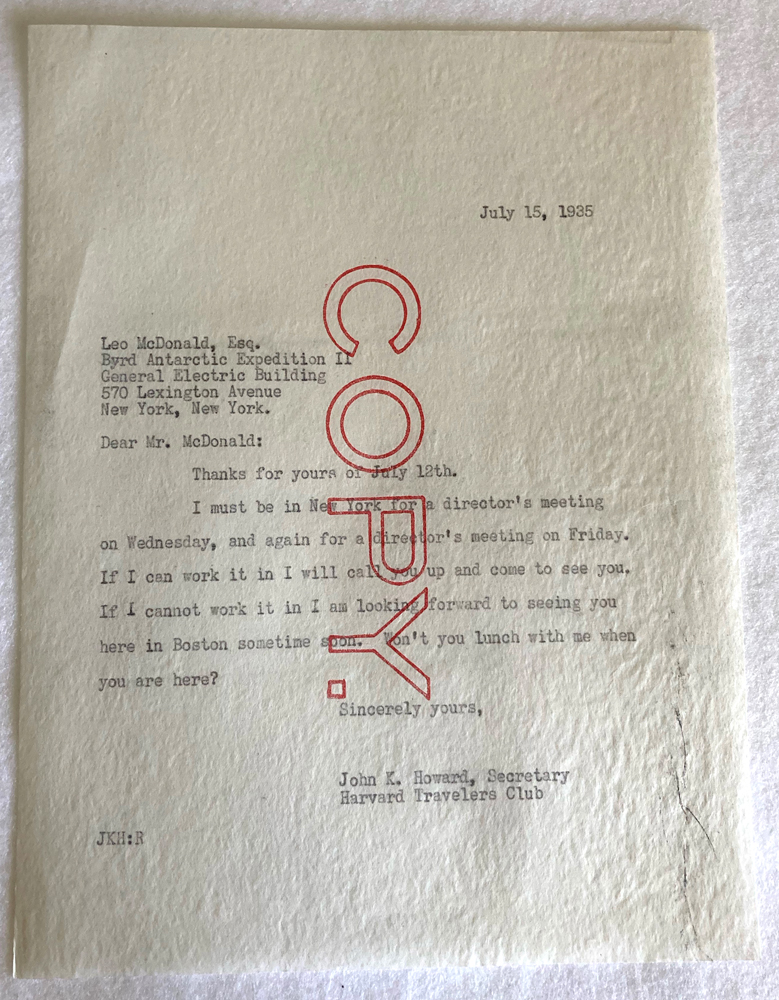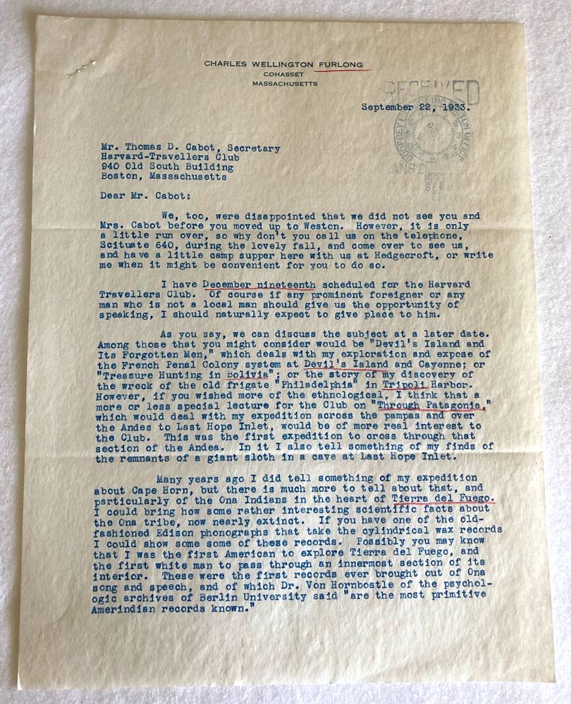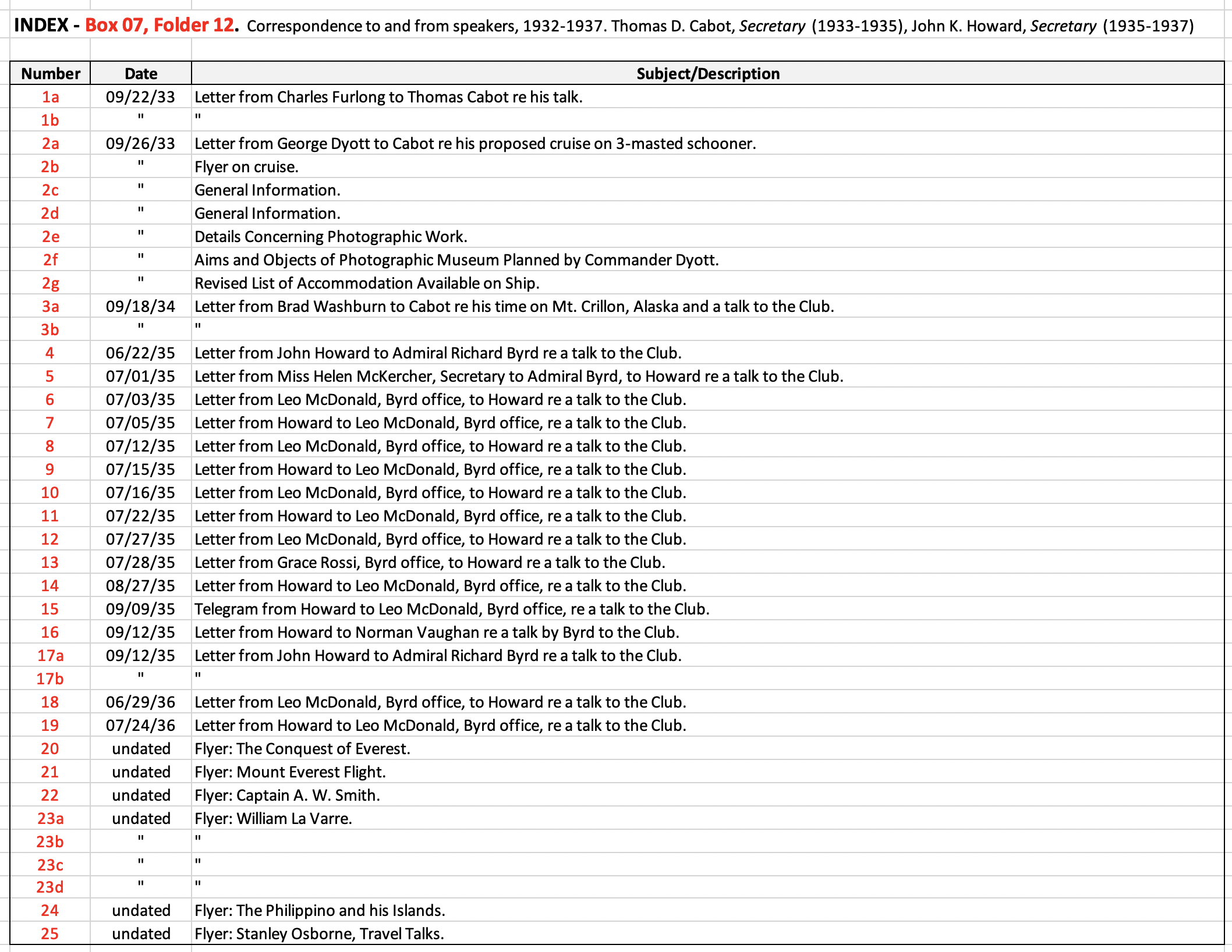 HARVARD TRAVELLERS CLUB ARCHIVES (Box 07, Folder 12) Correspondence to and from speakers, 1932-1937. Thomas D. Cabot, Secretary (1933-1935), John K. Howard, Secretary (1935-1937).