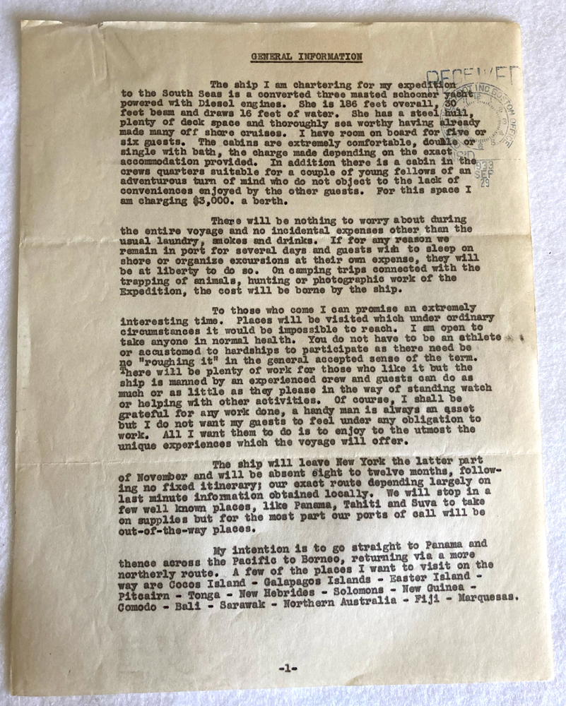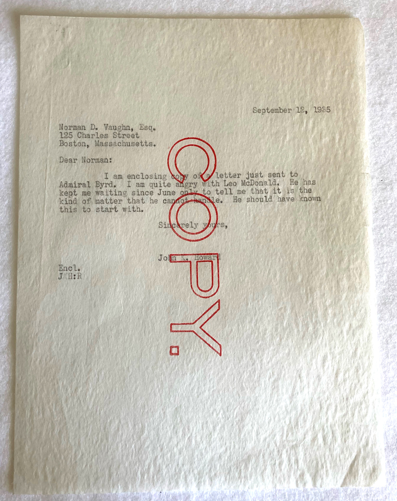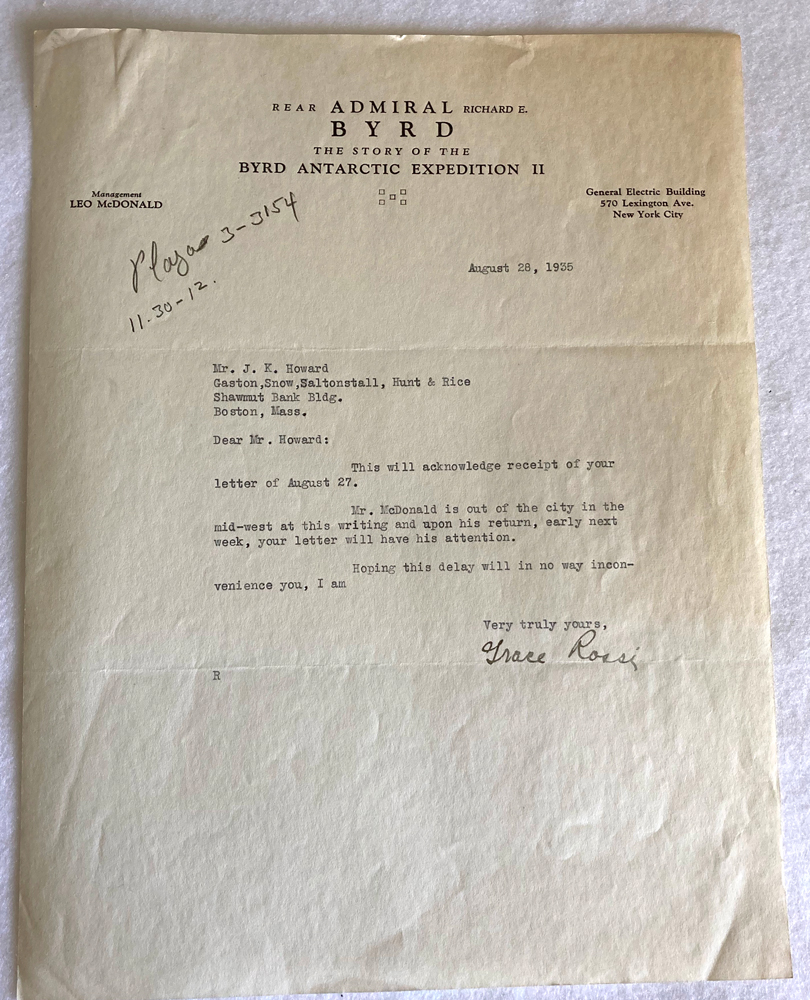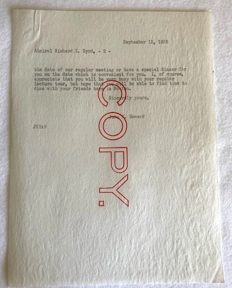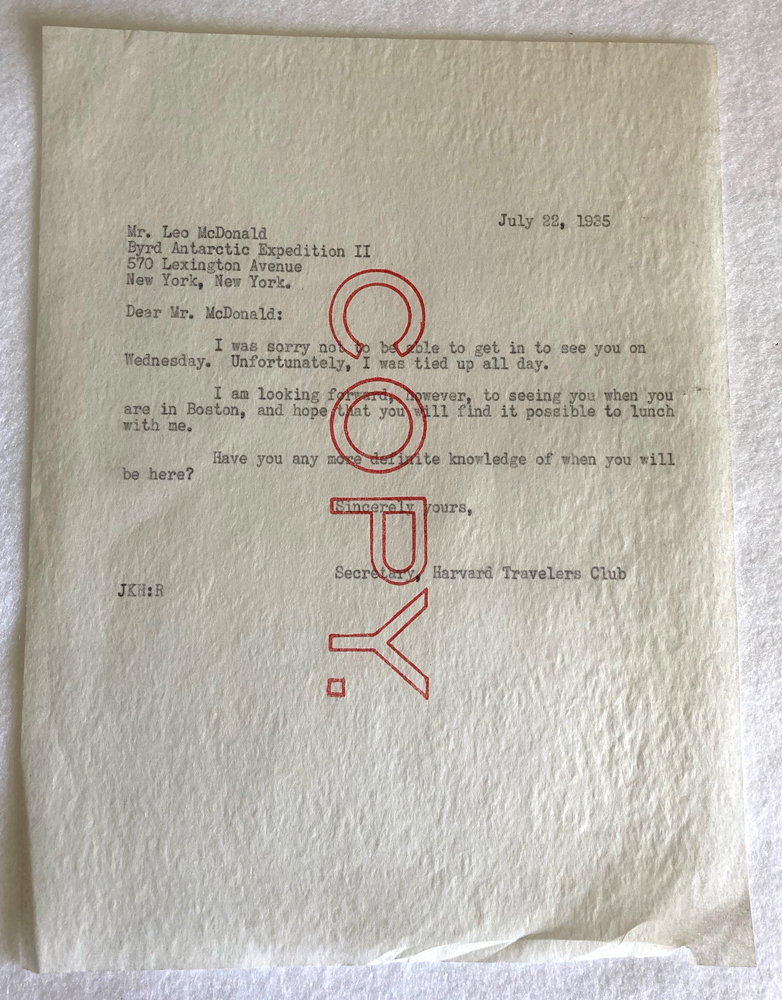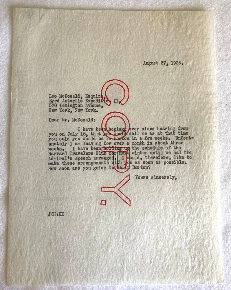 HARVARD TRAVELLERS CLUB ARCHIVES (Box 07, Folder 12) Correspondence to and from speakers, 1932-1937. Thomas D. Cabot, Secretary (1933-1935), John K. Howard, Secretary (1935-1937).