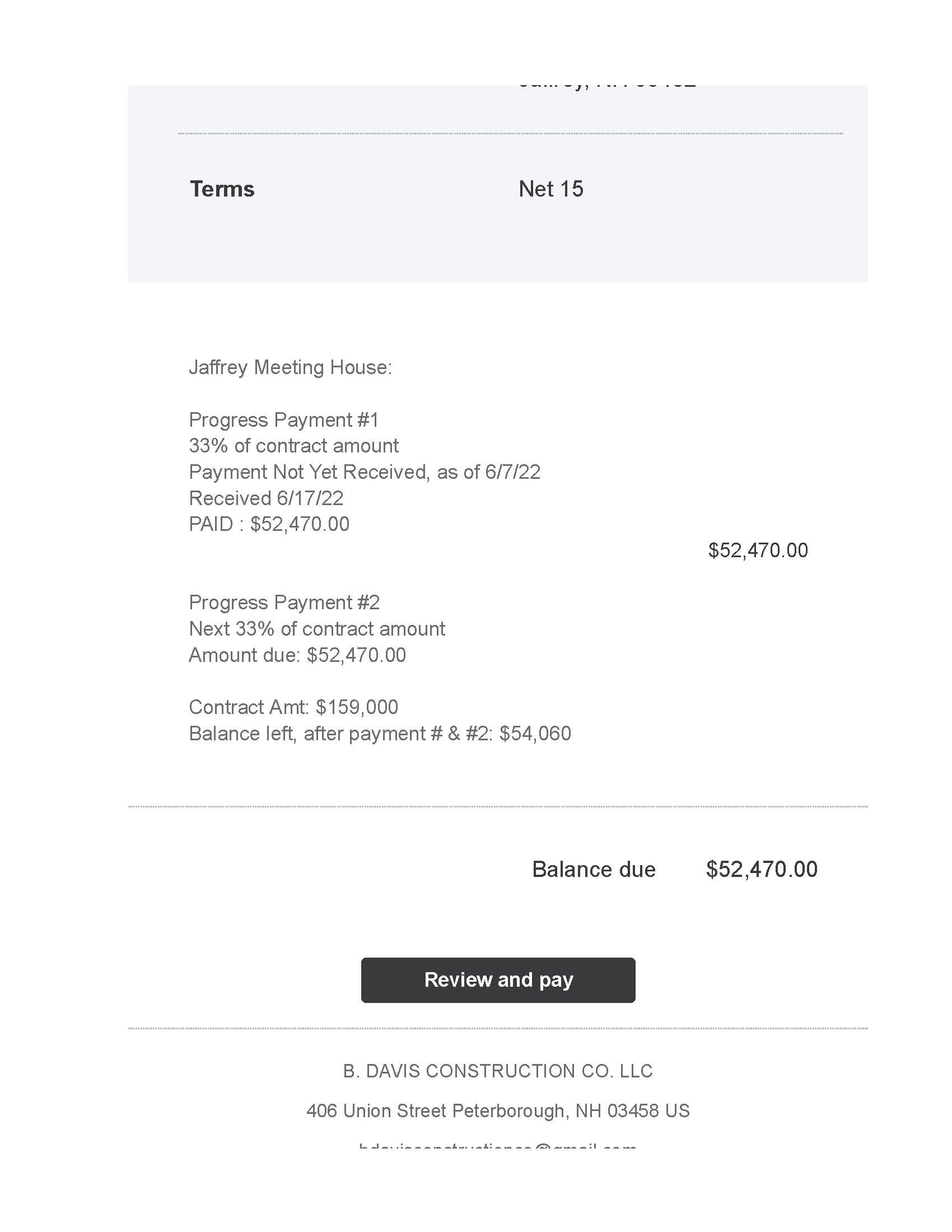 (#13) Invoice from Davis Construction, ? 2022. Progress Payment #2, 33% of contract amount.