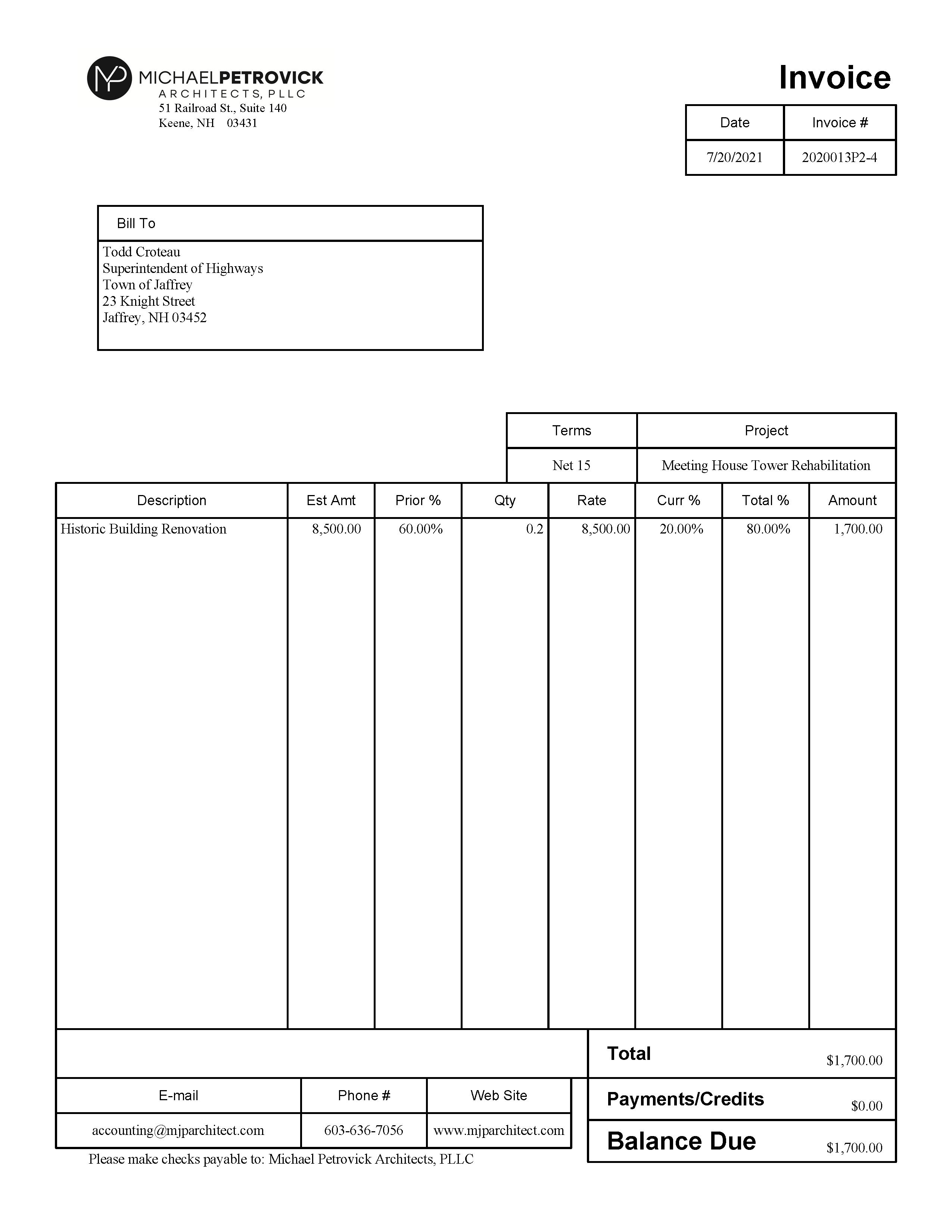 (#1) Invoice from Michael Petrovick, June 23, 2020. Historic Building Assessment.