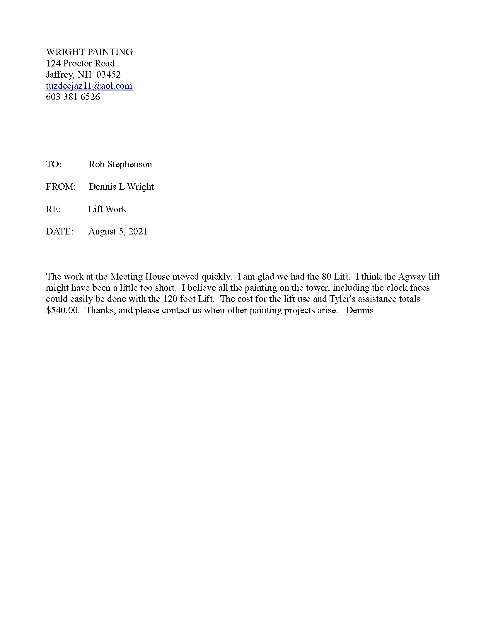 (#9) Invoice from Dennis Wright, August 5, 2021. Lift to remove deteriorating balustrade.