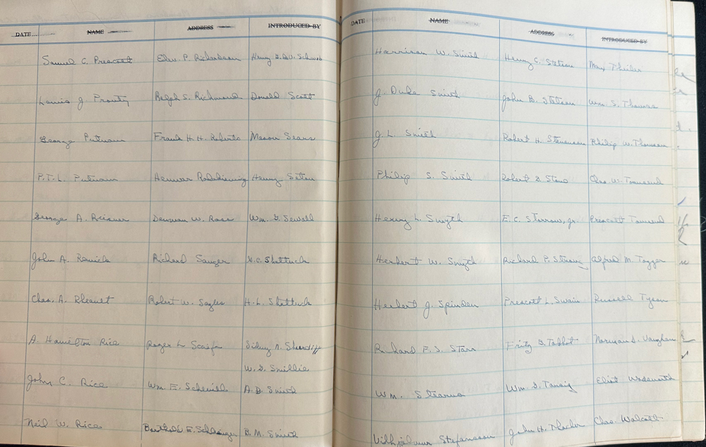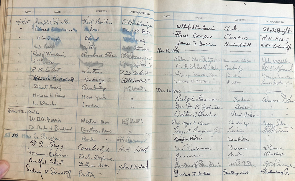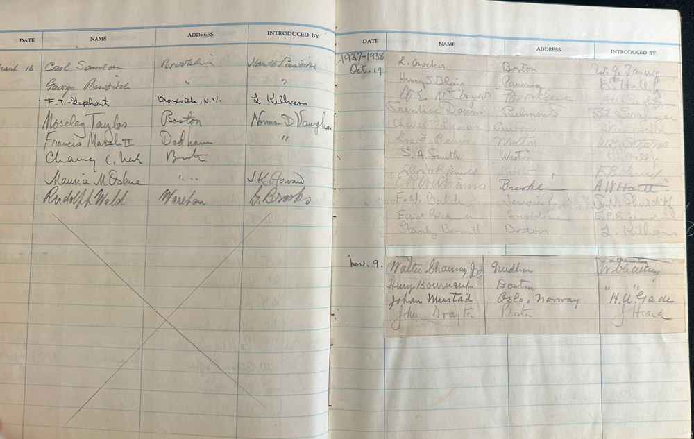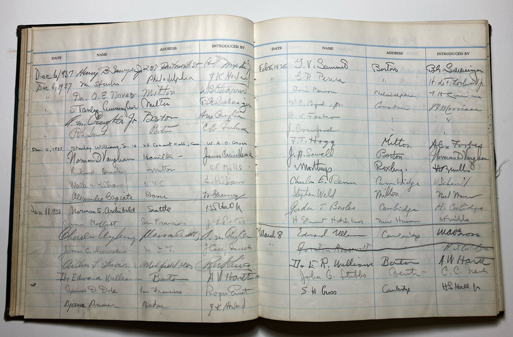 Bound book with no title other than 'Harvard Travellers Club' on front free endpaper and 'Register' on spine. The printed columns are: Date, Name, Address, Introduced By, appearing on recto and verso. There are 20 lines on each page. These are filled in in ink in the same hand. The handwritten title at the top of each page reads: 'Members of the Harvard Travellers Club.' The date column is left blank. The pages are unnumbered. Some pages in dates are added, the earliest being 12/18/1934. From here on out the names are entered in the handwriting of the person, some in pencil, others in ink. The dates appear to correspond with Club meetings. The book possibly was at each meeting and members and guests signed it. The most recent date is May 16, 1941. Perhaps 2/3 of the book is blank.
