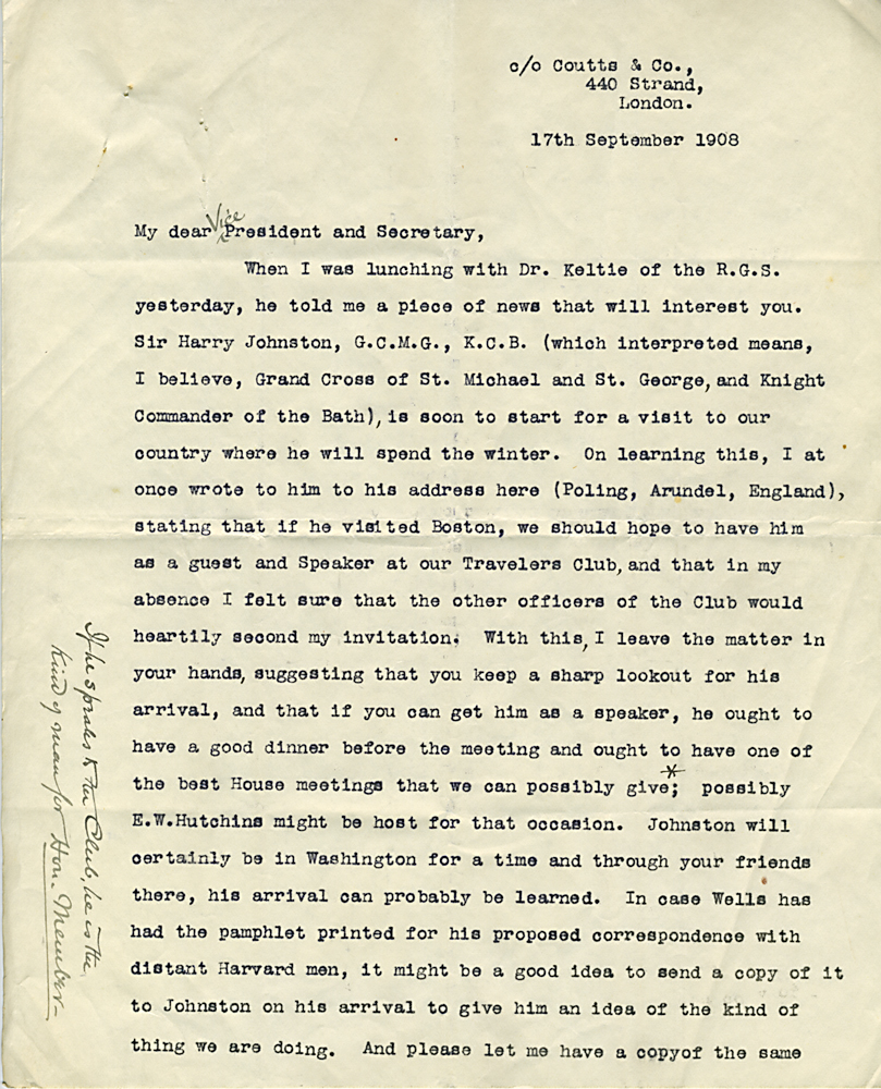 HARVARD TRAVELLERS CLUB ARCHIVES (Box 07, Folder 01) Correspondence Prior to 1911.