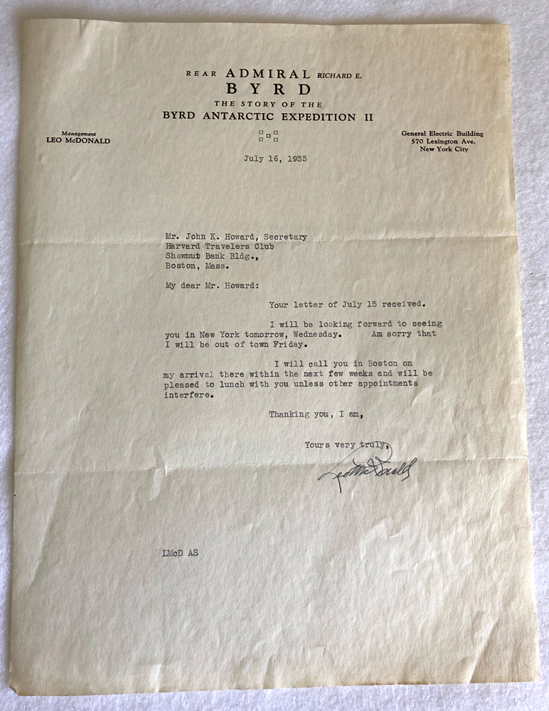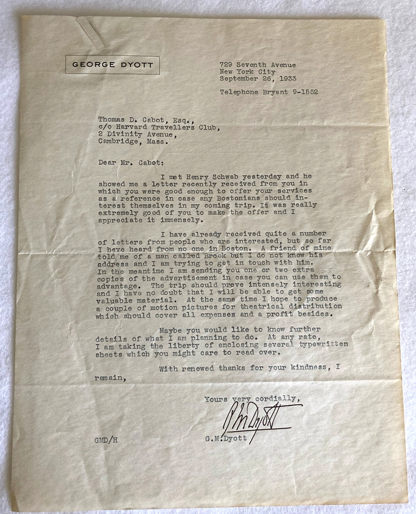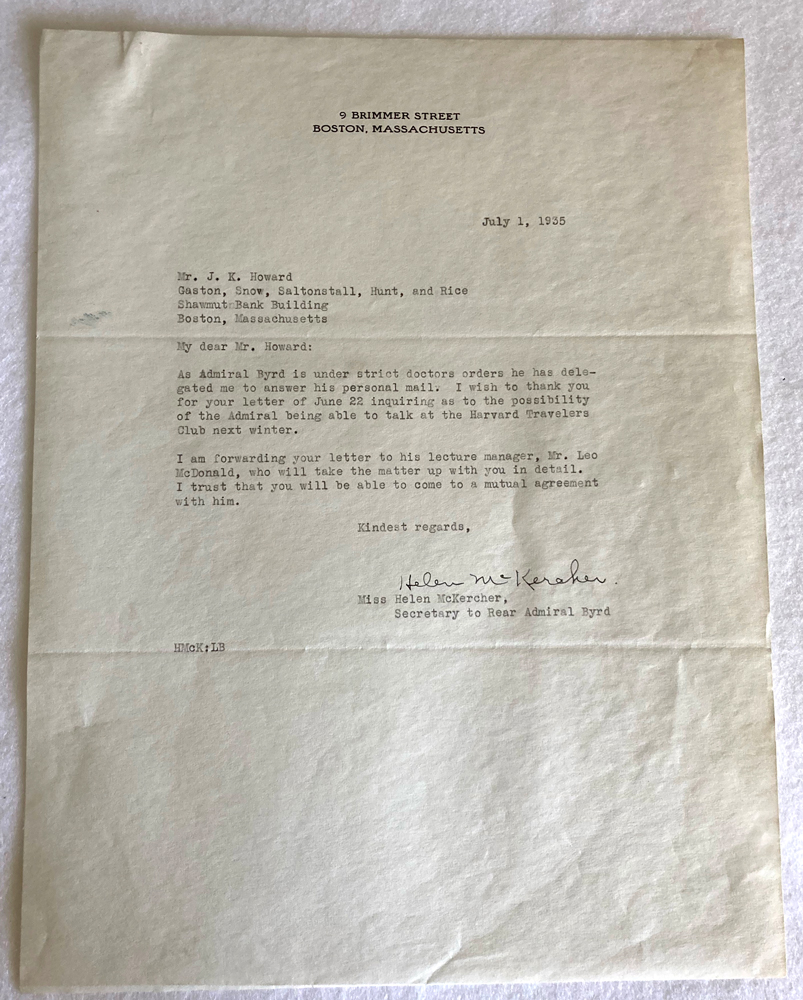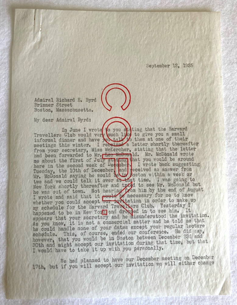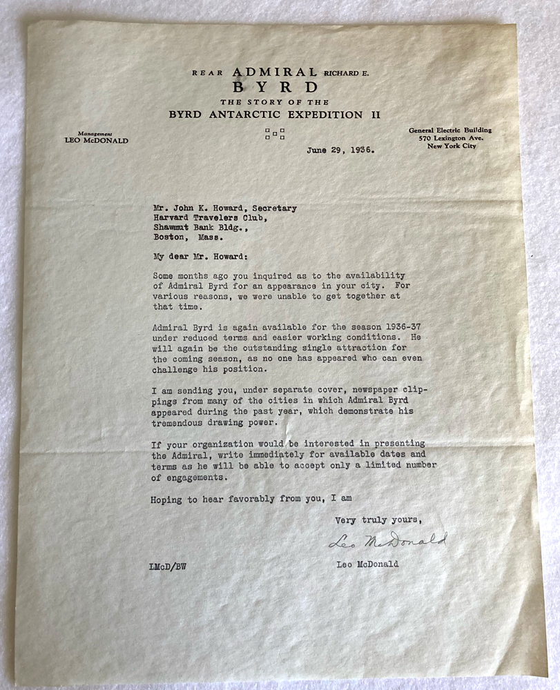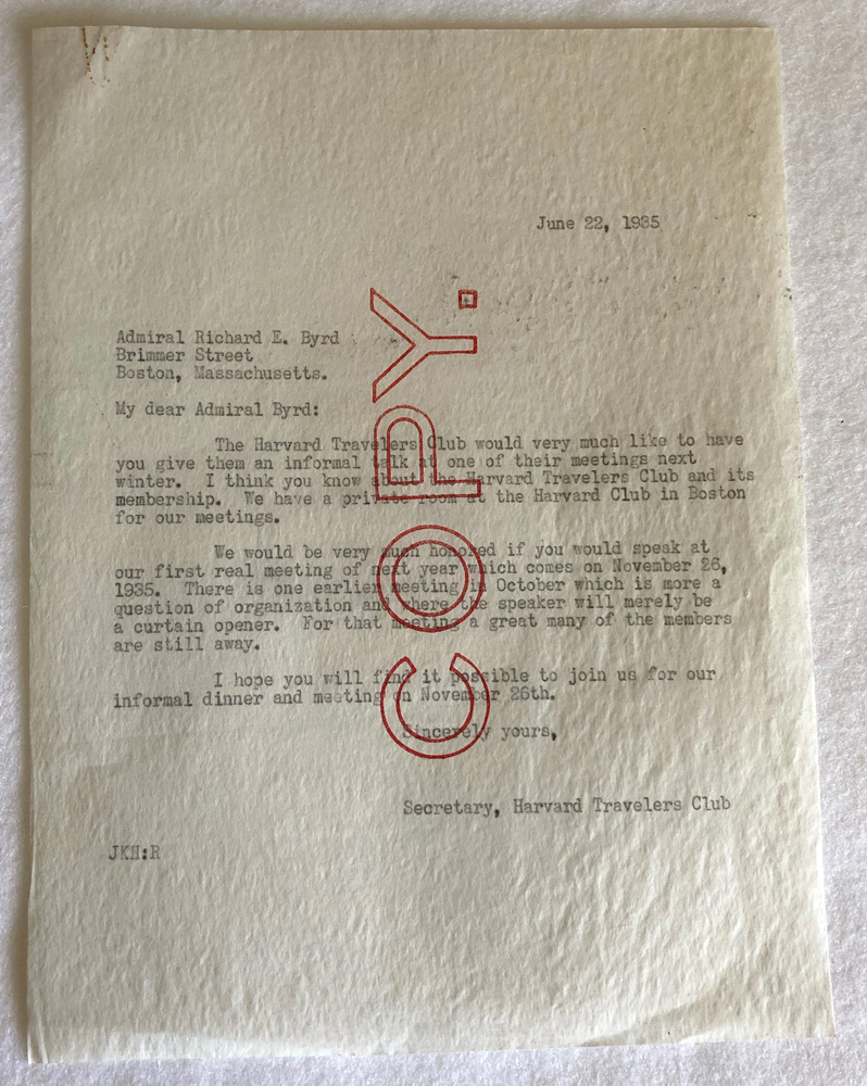 HARVARD TRAVELLERS CLUB ARCHIVES (Box 07, Folder 12) Correspondence to and from speakers, 1932-1937. Thomas D. Cabot, Secretary (1933-1935), John K. Howard, Secretary (1935-1937).
