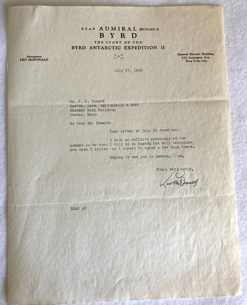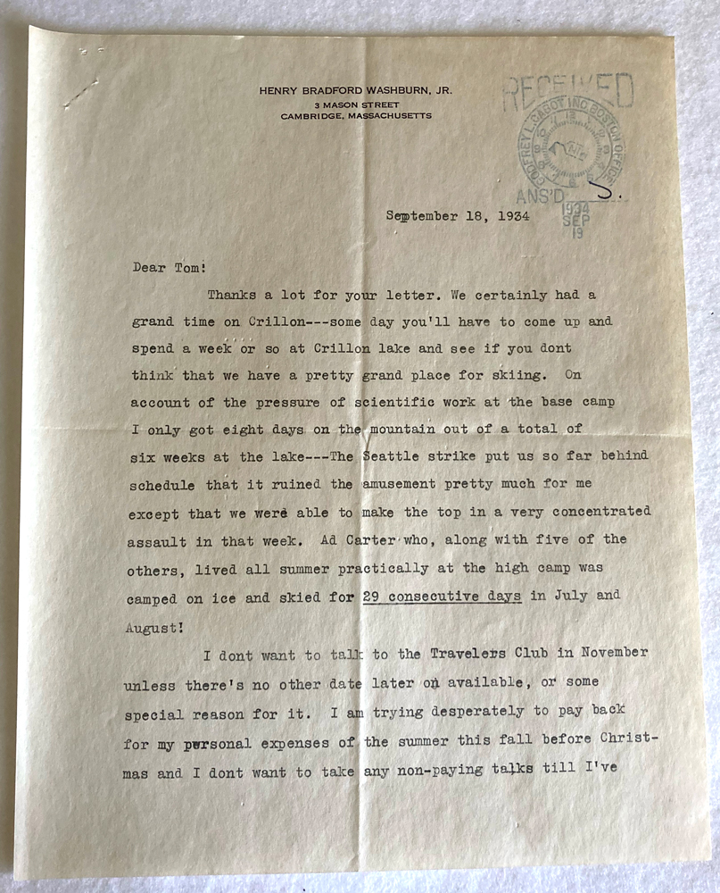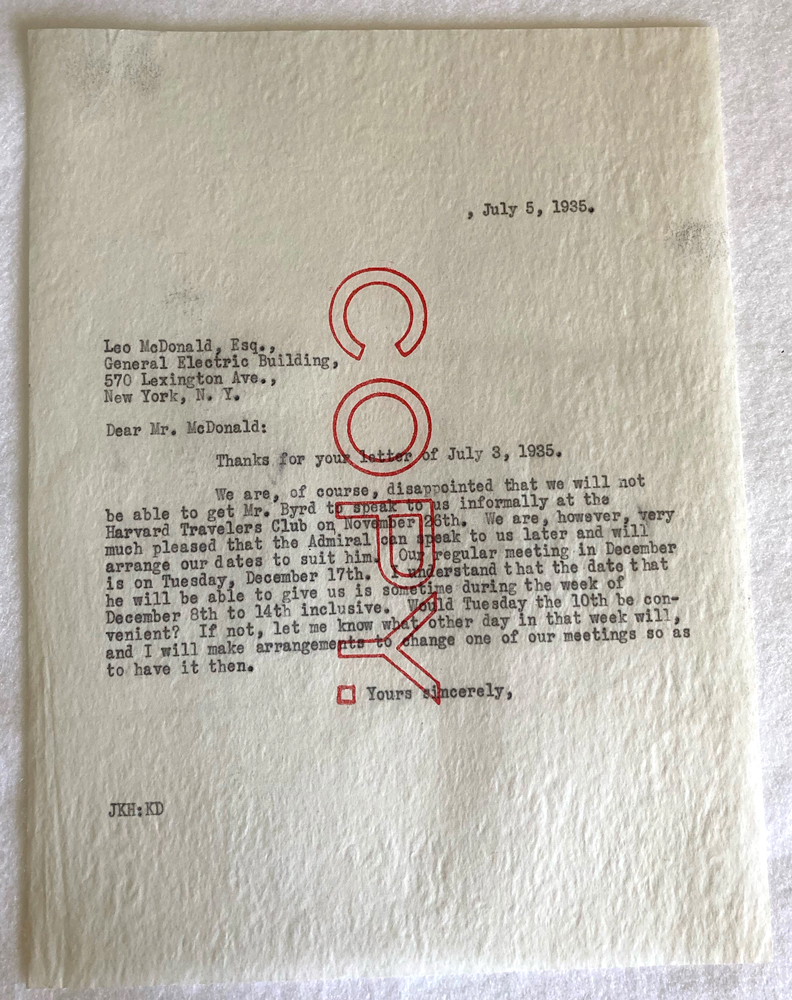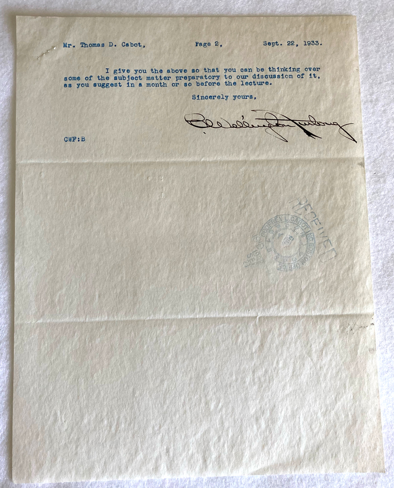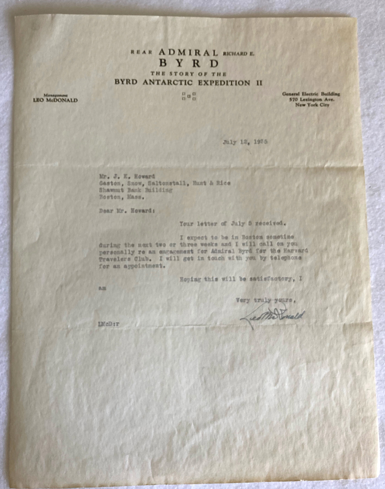 HARVARD TRAVELLERS CLUB ARCHIVES (Box 07, Folder 12) Correspondence to and from speakers, 1932-1937. Thomas D. Cabot, Secretary (1933-1935), John K. Howard, Secretary (1935-1937).
