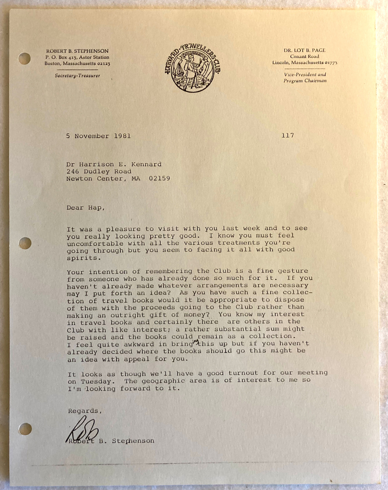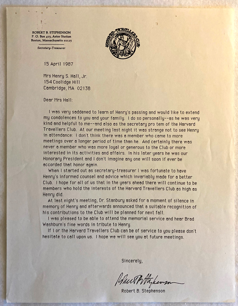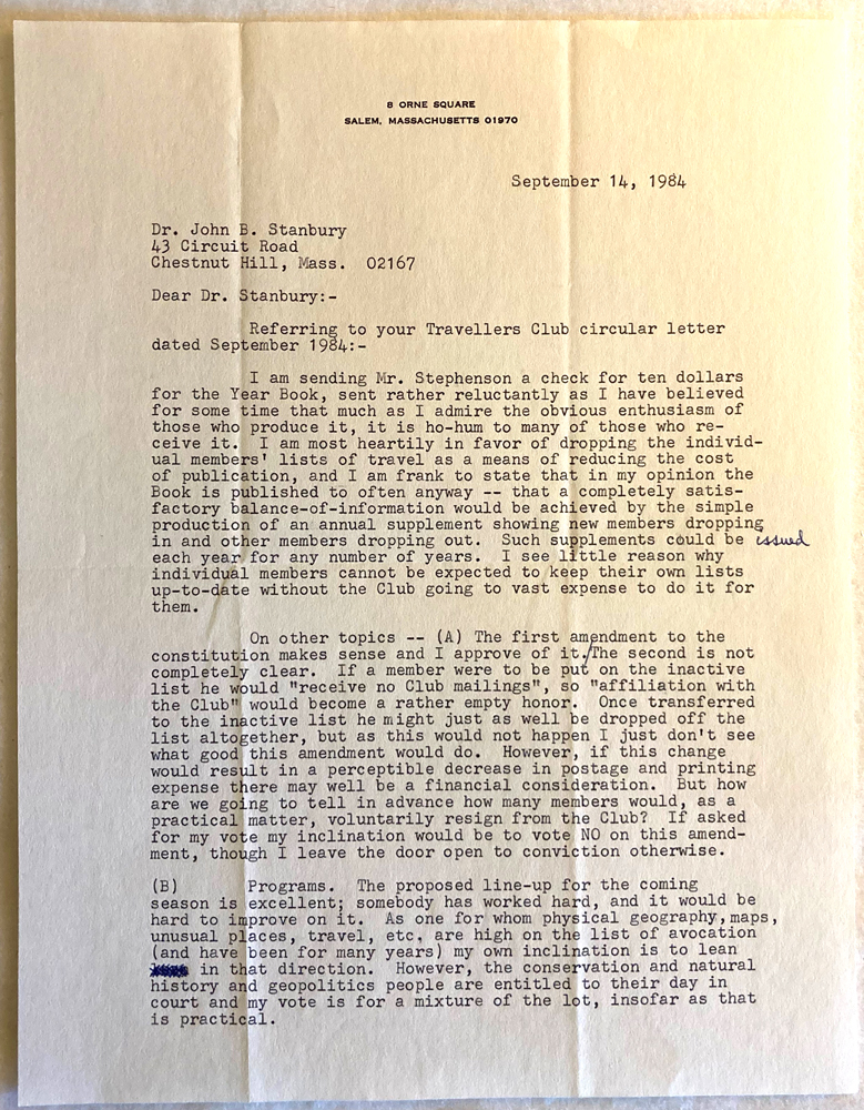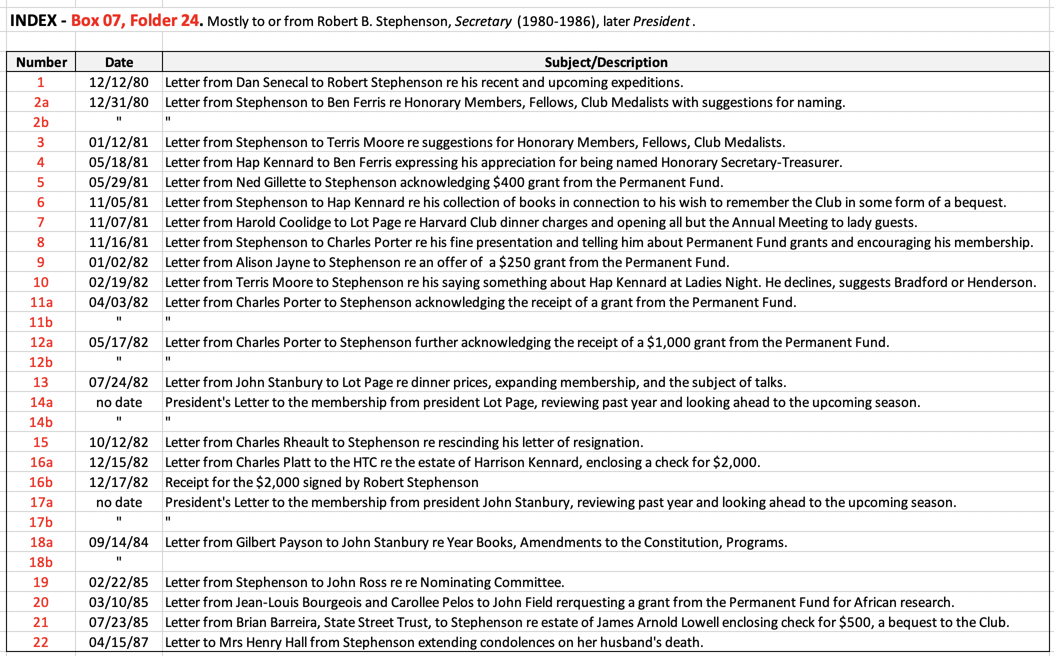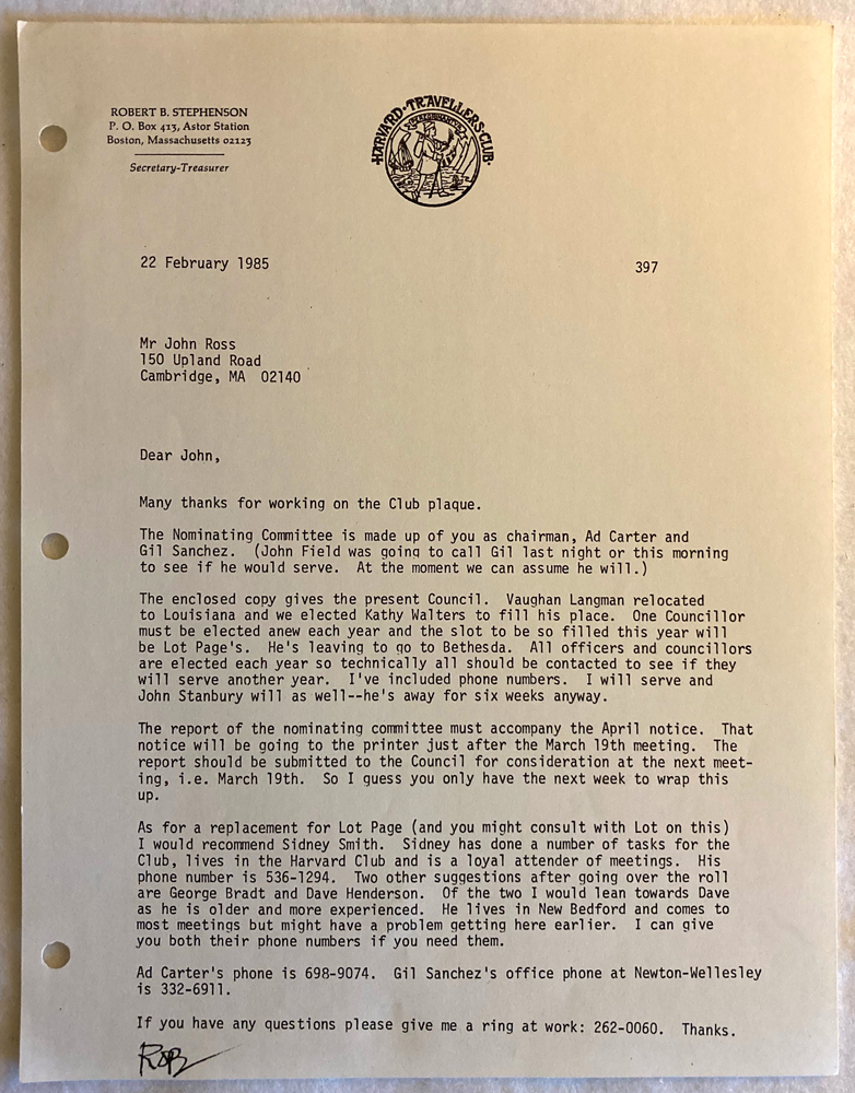 HARVARD TRAVELLERS CLUB ARCHIVES (Box 07, Folder 24) Mostly to or from Robert B. Stephenson, Secretary (1980-1986), later President.