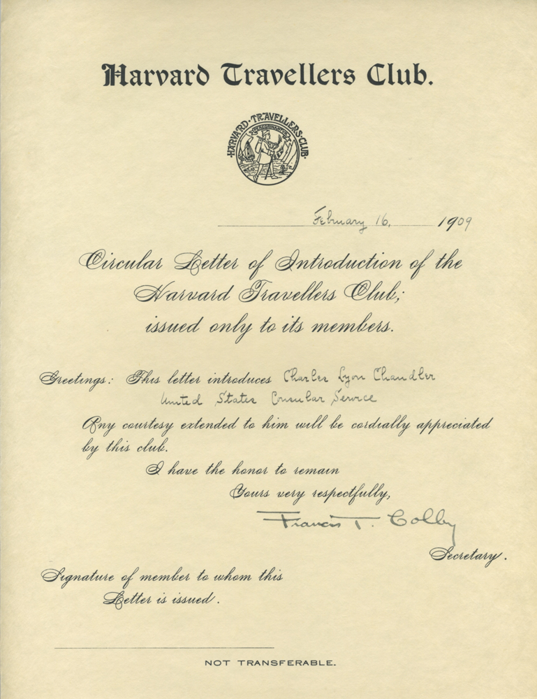 ✔ 1. Circular Letter of Introduction . Single sheet with 'Harvard Travellers Club' at the top over the Club Seal. Two examples: one blank and the one made out to William Bayard Cutting, Jr., signed by Francis T. Colby, Secretary. Dated: February 16, 1909. [1]p.✔ 2. A Circular Regarding Correspondence with Distant Harvard Men. No date [1908 or 1909]. [8]pp.