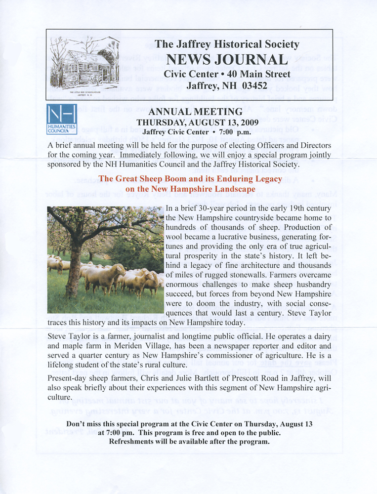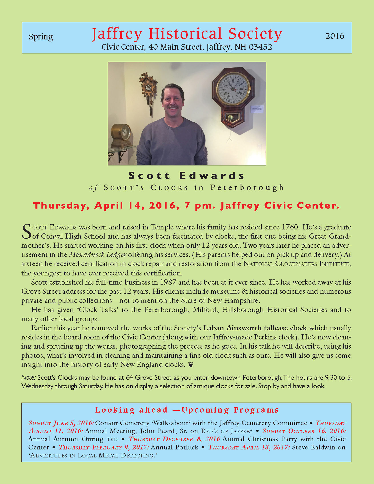 Spring Meeting. Thursday, April 16, 2020. Jaffrey Civic Center. Steve Taylor, NEW HAMPSHIRE'S ONE-ROOM RURAL SCHOOLS: THE ROMANCE AND THE REALITY. CANCELLED due to Covid-19 concerns.