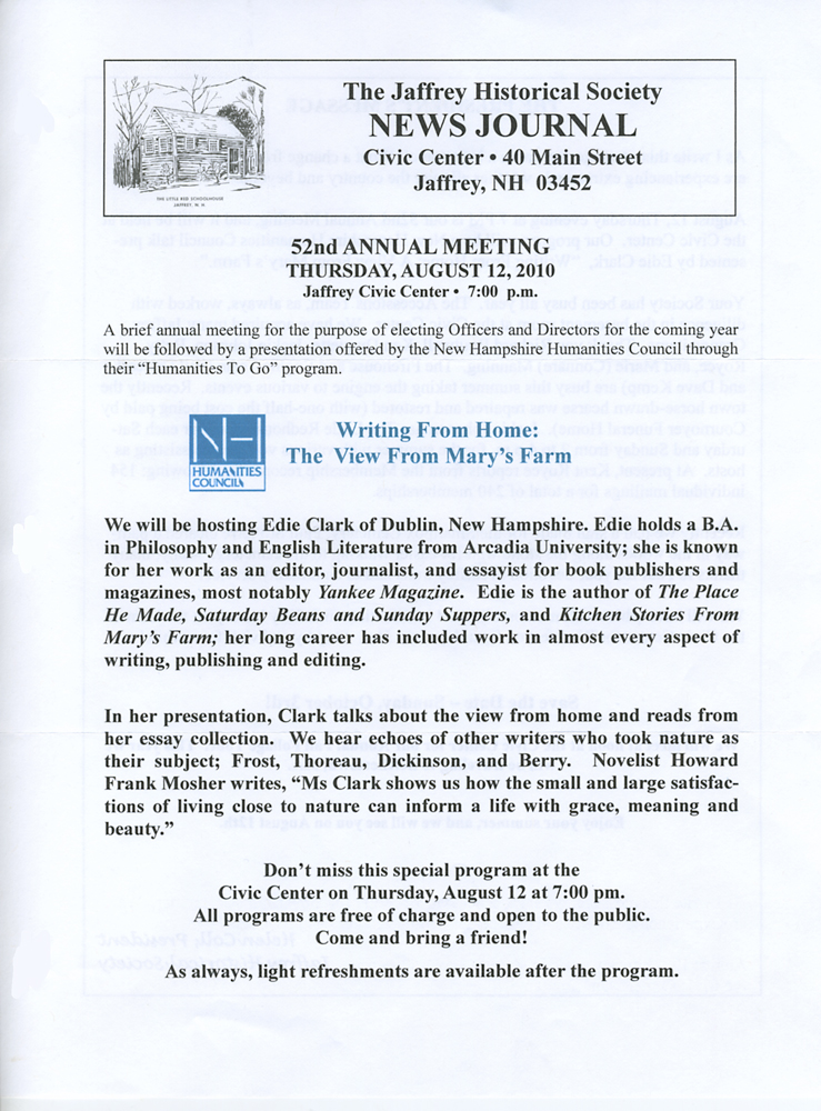 "Dear Friend…Jaffrey Postcards to Here & There." A Jaffrey Historical Society exhibit at the Civic Center, 4-28 August 2017. The Perkins Clock The Laban Ainsworth Clock Handout on Jaffrey Center sites/sights for Visit of Ashby, Royalston and Hancock Historical Societies. Town of Jaffrey Annual Reports (1925-2009 with a few missing) A Jaffrey Quiz from the February 12, 2015, Pot Luck program. And the answers. The first issue of the Monadnock Ledger, November 21, 1956. Jaffrey Jubilee Past & Present, August 7, 8, 9, 1964. (program) Dublin Archives Camp Monadnock handbook, 1964. Lake Contoocook / Lake Sunshine