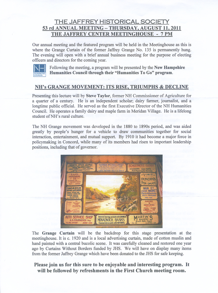Laban Ainsworth biography project Baptist Weathervane project Dean Murder project (This has been moved to jaffreyhistory.org) Hannah Davis update Hearse House project Town Anniversaries Celebrating the Jaffrey's anniversaries. The Town was incorporated on August 17, 1773. Jaffrey 250s Celebrating the Jaffrey's 250th Anniversary.THE SOCIETY
