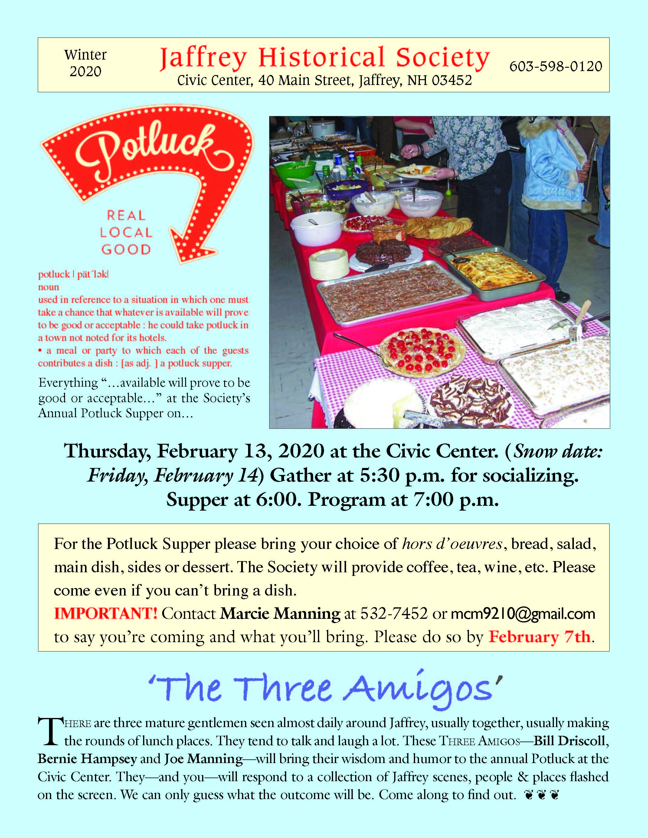 Potluck. Thursday, February 9, 2023, 5pm onward, Jaffrey Civic Center.
